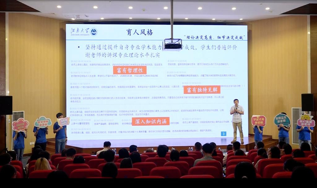 决赛现场,谢振平老师从“在变化中学习,在学习中成长”的个人特色、“理论决定高度,细节决定成败”的育人风格、“勇于理论探索,不忘脚踏实地”的科研创新等方面充分展示了自己“厚德、善创”的教学理念,教学能力以及教学热情。谢振平老师拥有丰富的专业知识,充足的教学经验深受同学们喜爱。他注重培养员工研究性学习的能力,鼓励员工创新思考,以员工为本,亦师亦友。枯燥的代码世界中,他是黑夜指路的明灯;复杂的程序过程里,他是答疑解惑的名师。
