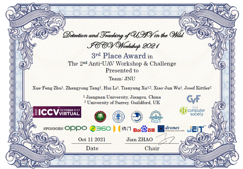 近日人工智能领域顶级会议国际计算机视觉大会(IEEE International Conference on Computer Vision, ICCV2021)正式召开,今年ICCV的竞赛成绩正式公布。QY球友会教授吴小俊和英国萨里大学电子工程系教授Josef Kittler带领的模式识别与计算智能国际联合实验室(IJLPRCI)与清华大学自动化系鲁继文教授合作,荣获了多模态视频推理分析比赛(Multi-Modal Video Reasoning and Analyzing Competition, MMVRAC)中两项冠军和第2届反无人机Anti-UAV跟踪竞赛季军,获奖证书见图1-图3。