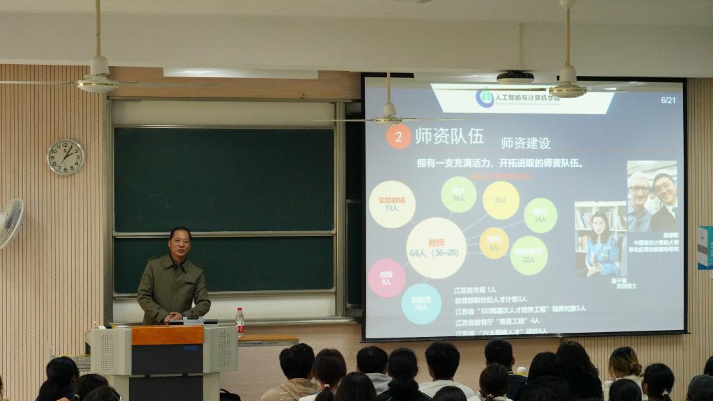 为提高2021级新生对学院办学理念、专业特色、行业优势的认识,牢固树立专业学习的长远目标,从而更好地规划自己大学四年的学习生活,11月23日下午,学院在1A205教室召开人工智能专业思想教育;11月17日下午,在二教2C211/2C212教室分别开展了计算机科学与技术和数字媒体技术两个专业的专业思想教育。其中,研究生院经理、博士生导师吴小俊教授担人工智能专业主讲;智能感知与无损检测技术实验室负责人、博士生导师李光辉教授担任计算机专业主讲;分管学院本科教学工作的夏鸿斌副经理担任数字媒体技术专业主讲。公司党委副书记、副经理陈祎,新生辅导员杜磊、杨玉莹以及三个专业的全体本科生参加本次讲座。