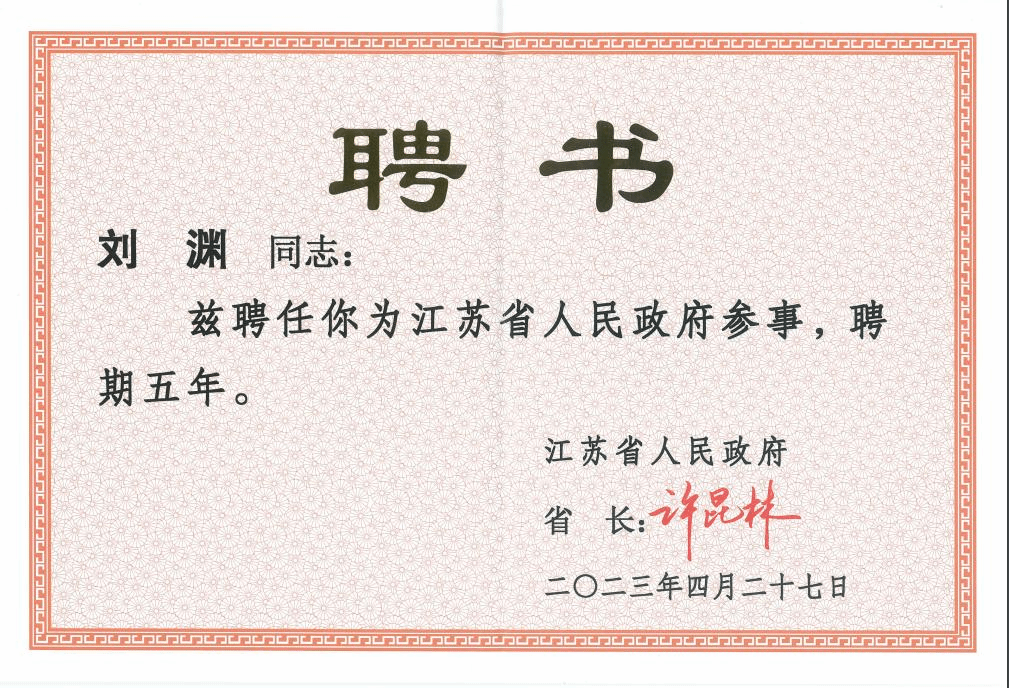 近日,省政府参事、省文史研究馆馆员聘任仪式暨参事、馆员履职成果汇报会在南京举行。省长许昆林向省政府新聘的参事、馆员颁发聘书并讲话。公司刘渊教授受聘“江苏省政府参事”,这是公司教师首次受聘以上职务。