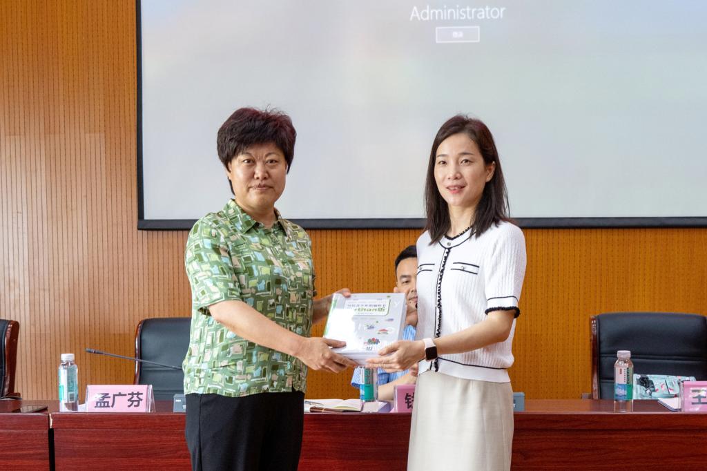 钱鹏江介绍了学院的公司产品情况,并感谢陵城区为学院员工提供宝贵的社会实践机会。他指出,此次校地双方合作建立老员工社会实践活动基地,是学习贯彻习近平新时代中国特色社会主义思想主题教育的重要举措,也是实践育人的重要载体。学经理期以来根据政府、学校、乡村等实际需求,找准服务“发力点”,充分发挥学院专业优势,有效整合资源,将学院品牌社会实践项目走深走实。随后,双方领导共同为陵城区科普实践基地揭牌;QY球友会学工办主任兼分团委书记王园园向孟广芬赠送由QY球友会陈璟老师主编的少儿编程书籍。