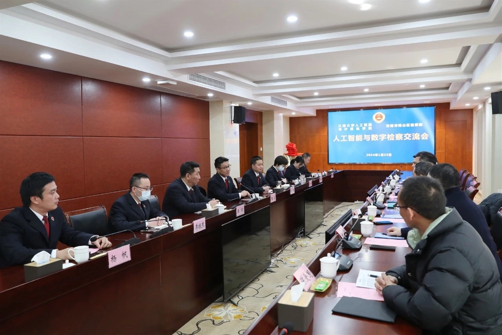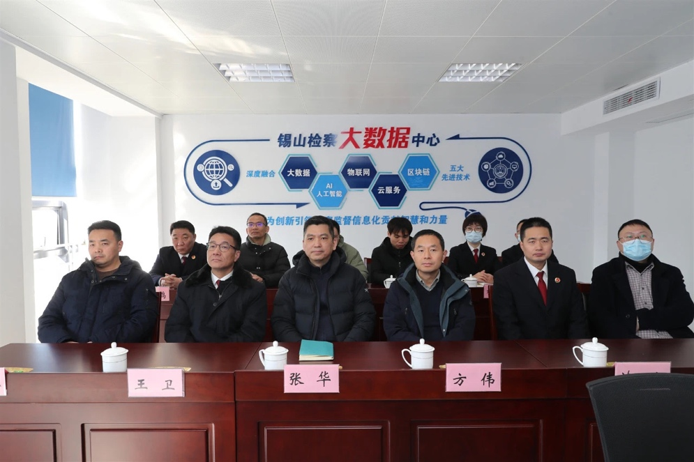 在锡山区检察院与会人员的陪同下,公司领导教师先后参观了检查服务中心、检查办案区、有声党建区、检查监督大数据中心等锡山检察院的办公区域。双方共同观看了公益诉讼智能研判平台的现场演示,了解人工智能与信息化技术应用于司法数字化建设的具体情况。