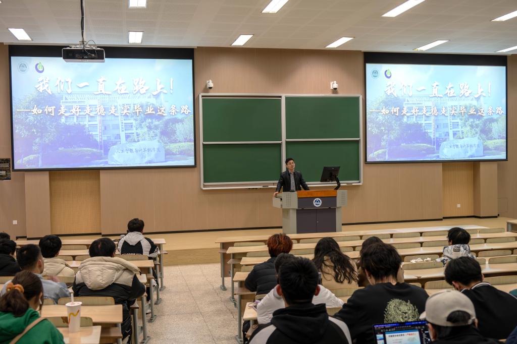 就业专题上,辅导员杜磊从一线HR参加校招的真实感受入手,理性分析了计算机类专业的就业现状,并结合就业地图,进一步分析了岗位分布、岗位需求、学科要求、薪资待遇、求职技能等员工关切度高的内容。