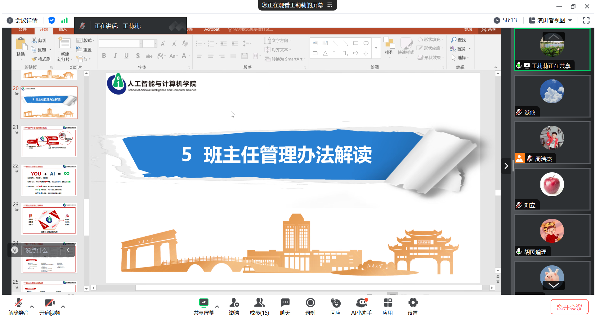 王莉莉解读了《QY球友会班主任管理办法》《QY球友会班主任岗位责任书》等文件,理清了班主任的工作职责、工作要求和工作目标。她从工作实际出发,结合案例分享,重点指导了班主任在思想政治教育、安全稳定、学风建设、生涯规划等方面的工作方法,希望班主任以教育者的担当、育人者的情怀、同行者的温度,齐心构建育人矩阵,合力提升育人质量。