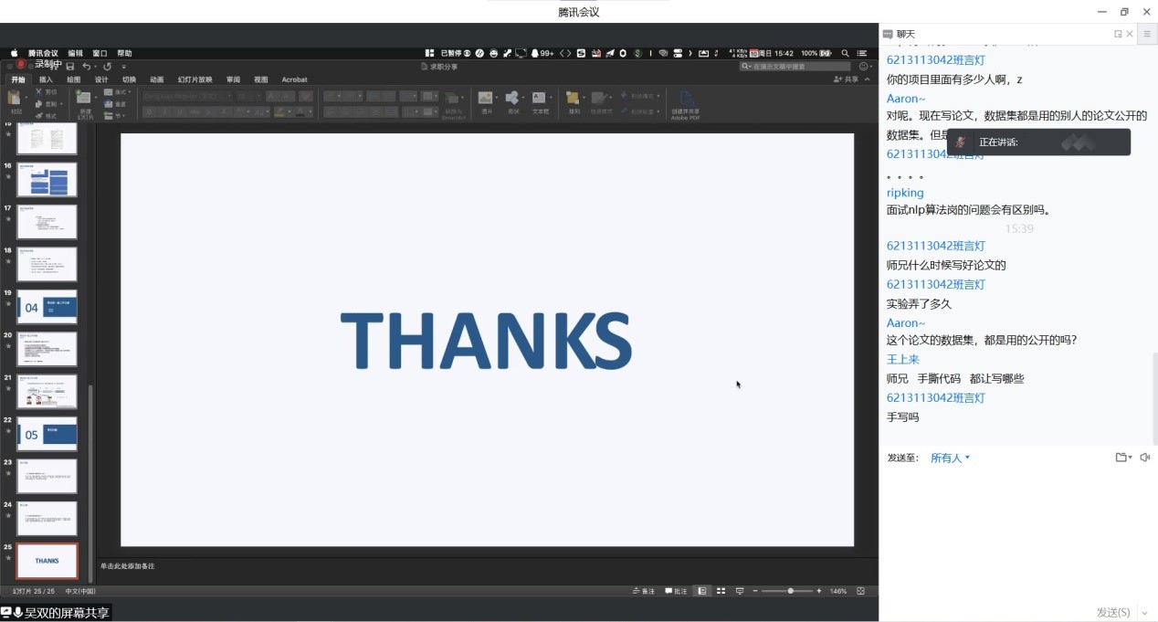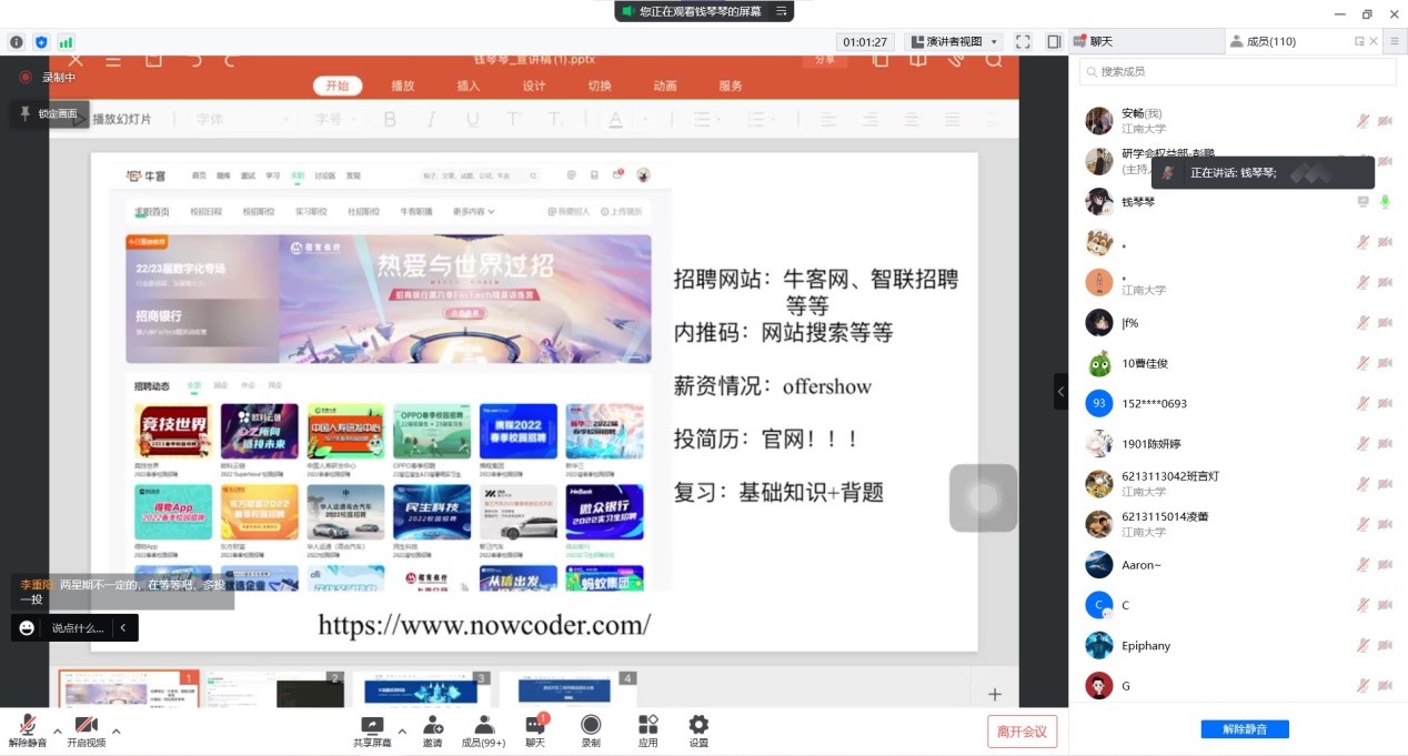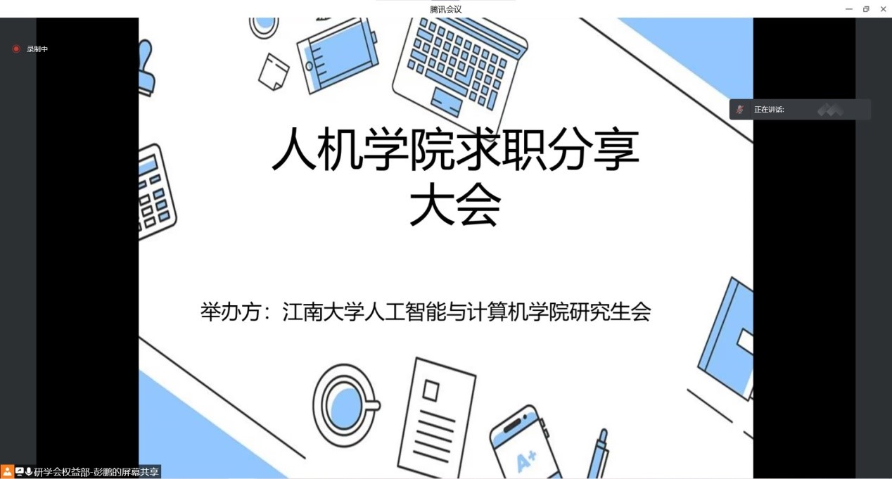 大会开始,主持人彭鹏介绍了本次活动的目的、意义及流程。随后四位同学从前期如何刷题,看书备战笔试,到准备阶段如何投递简历,进入面试后掌握强大的面试技巧等不同的角度进行了详细讲述。李重阳成功应聘腾讯开发岗位,鼓励同学们多去刷力扣练习题,弄懂LeetCode前 200 道题目分类练习和牛客网高频题目,这样笔试会轻松很多。钱琴琴应聘的是小米测试开发岗位,给同学们提供了“多看面试经验贴”的建议,以避免陷入盲目的题海,迷失方向。毛腾飞则是从如何把握科研学习和工作的方面深入,由于他研究生期间从事的研究方向是深度学习,且应聘的蔚来算法岗也与之有关。他告诉同学们要有丰富的实习经历,活学活用,将自己科研运用到实际项目中。吴双成功应聘腾讯算法岗,提醒大家“走公司内推”方式,避免前期笔试招聘,可以大大提升拿到offer的成功率。随后同学们踊跃在线交流提问,四位分享者也进行了耐心细致的解答。