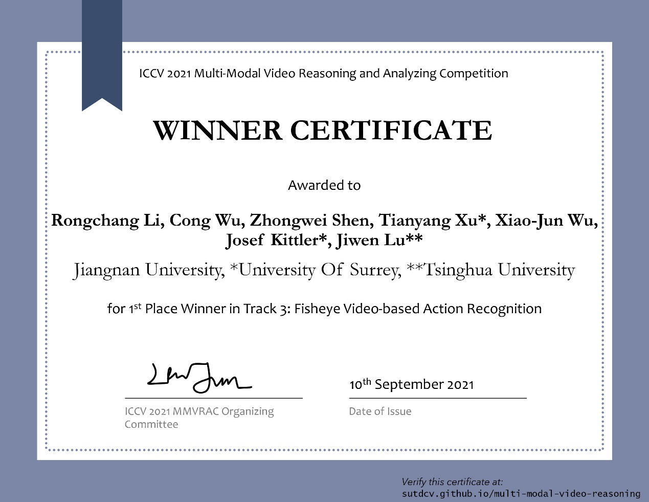 此前,在2021下半年人工智能领域顶级会议国际计算机视觉大会(IEEE International Conference on Computer Vision, ICCV2021)上,公司团队与英国Surrey大学和清华大学合作荣获了多模态视频推理分析比赛MMVRAC中2项冠军(吴聪,李荣昌,沈忠伟,徐天阳,吴小俊,JosefKittler,鲁继文)和第二届CVPR反无人机Anti-UAV跟踪竞赛季军(朱学峰、汤张泳,李辉,徐天阳,吴小俊,JosefKittler)。近年来公司大力推进市校合作和国际合作,大力支持人工智能快速发展,公司在人工智能领域获得的这些重要荣誉和奖项,将进一步提高球友会官方网站在国内和国际人工智能领域的影响力,推动公司人工智能学院与计算机学院和先进技术研究院的发展。
