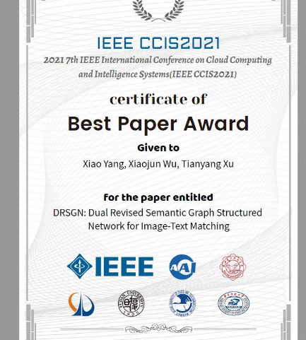 跨模态任务打破了视觉和自然语言之间的壁垒,而视觉和文本匹配则是跨模态中重要的先驱任务。来自实验室的硕士生杨枭在该方向上也取得了突破,他所完成的一篇跨模态检索工作在细粒度视觉文本匹配基础上,进一步设计了阶段注意力模块,额外加入了场景信息约束,补充了细粒度模态匹配中全局视觉信息的缺失,在跨模态匹配任务中取得了显著效果,获得了2021CCIS国际会议的最佳论文奖(杨枭,吴小俊,徐天阳)。
