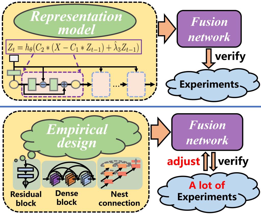 深度神经网络在视觉信息融合任务中已经取得了优异的性能,网络结构在融合过程中扮演着非常重要的角色。然而在人工智能领域,神经网络结构的设计仍然是一个黑盒问题。为了探索这一问题,该文提出了一种视觉信息融合的数学优化模型,并揭示了模型最优解与融合网络结构之间的联系。基于上述思想,该文提出了一种新颖的构建轻量级深度学习方法,使用优化模型指导网络结构设计,避免了使用试错策略来设计深度网络结构,如图1所示。为促进人工智能领域的发展,论文的算法代码和数据均已开源:https://github.com/hli1221/imagefusion-LRRNet