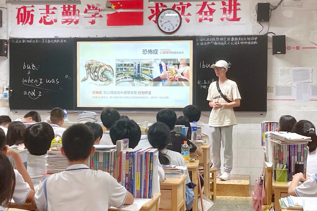 在信息时代,青少年在网络、各类社交媒体的影响下,彼此之间的交流变得越来越少。实践团成员结合自身在班级开展朋辈团拓的经验,设计了一系列温暖有趣的心理小游戏,带领高二学子开展了以“告别emo,开怀一夏”为主题的团体心理辅导。同学们积极展示自我,分享告别emo小妙招,在欢乐幽默的氛围中互相敞开心扉,欢乐畅谈。“感谢学长,让我对老员工活充满期待”、“学习压力减轻了很多,也学到了调节心态的方法”、“让我对即将到来的高三生活充满了信心”……听到学弟学妹的这些感受,实践团成员更坚定了持续开展“返家乡”社会实践的信念和信心,立志为高中学子心理健康保驾护航。