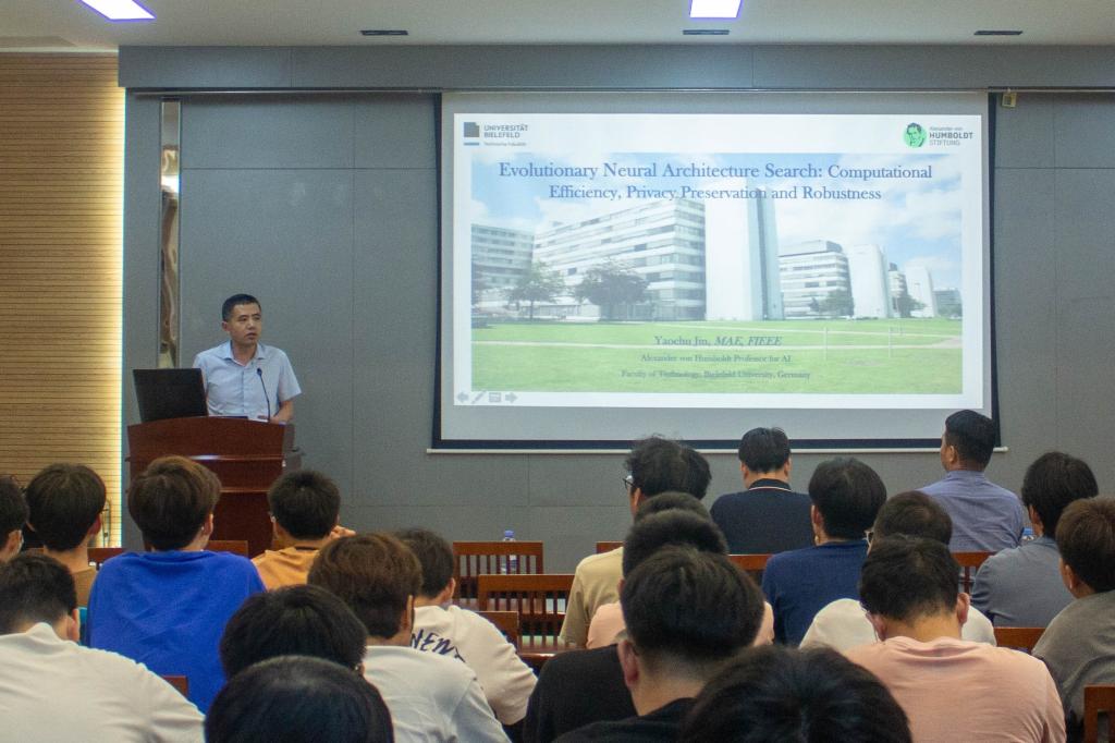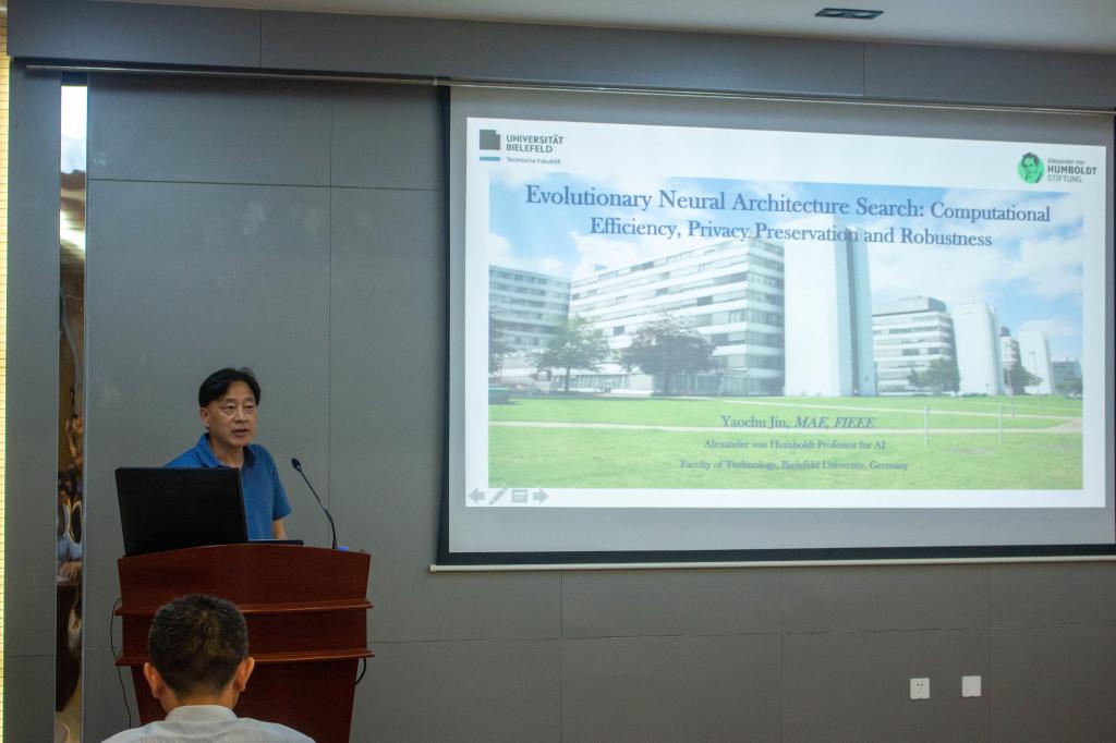 7月20日下午,欧洲科学院院士、IEEE Fellow,德国比勒菲尔德大学工程学院“洪堡人工智能教席教授”金耀初应邀,来校为QY球友会师生作《Multi-objective evolutionary neural architecture search: Communication efficiency, privacy preservation, and adversarial robustness》主题讲座,讲座由学院副经理谢振平主持,副经理钱鹏江、宋威,教师代表王士同等70余名师生参加。
