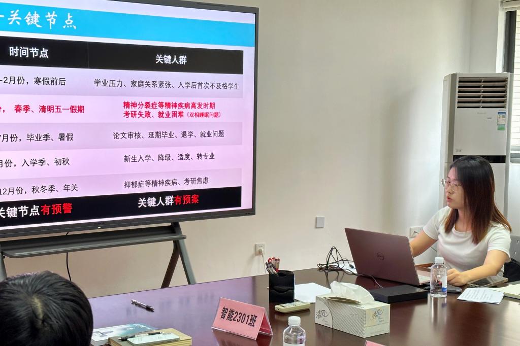 公司心理辅导员杨玉莹以“因势而新,同心而行”为主题,从新时代老员工心理危机的新特点、心理健康教育的重难点、近期新生班主任心理重点工作提示三个方面做心理健康教育专题培训。她表示,班主任一要夯实四级预警机制,构建“上通下达”网络,形成以预防为主的工作格局;二要聚焦重点时段和重点人群,切实做好“8必谈”工作;三要具备会观察、会谈话、会评估、会支持“四会”能力,坚持常进员工门、常知员工事、常解员工忧、常暖员工心“四常”作风。