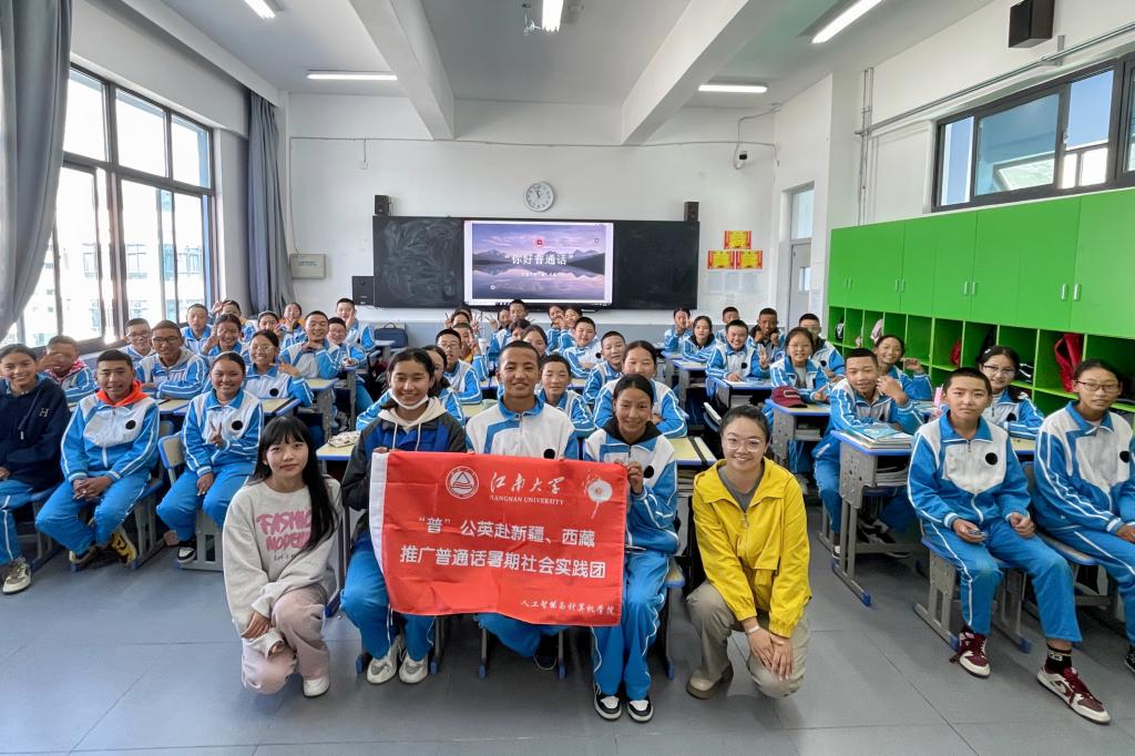 举办内地西藏班是党和国家加快培养少数民族和民族地区各类人才的重大战略决策,是贯彻落实党的教育方针和民族政策的创新实践。为激励青少年知党恩、听党话、跟党走,学好普通话,实践团成员旦珍向同学们普及内地西藏班的招生政策,强调了普通话在求员工涯中的重要性。在互动交流中,一个小朋友站起来说到:“老师,你们好厉害啊,我也要去上内地西藏班,我也要上大学,我要走出去看看江南是什么样子!”就这样,一个个小小的情怀与梦想在雪域高原慢慢生根发芽……