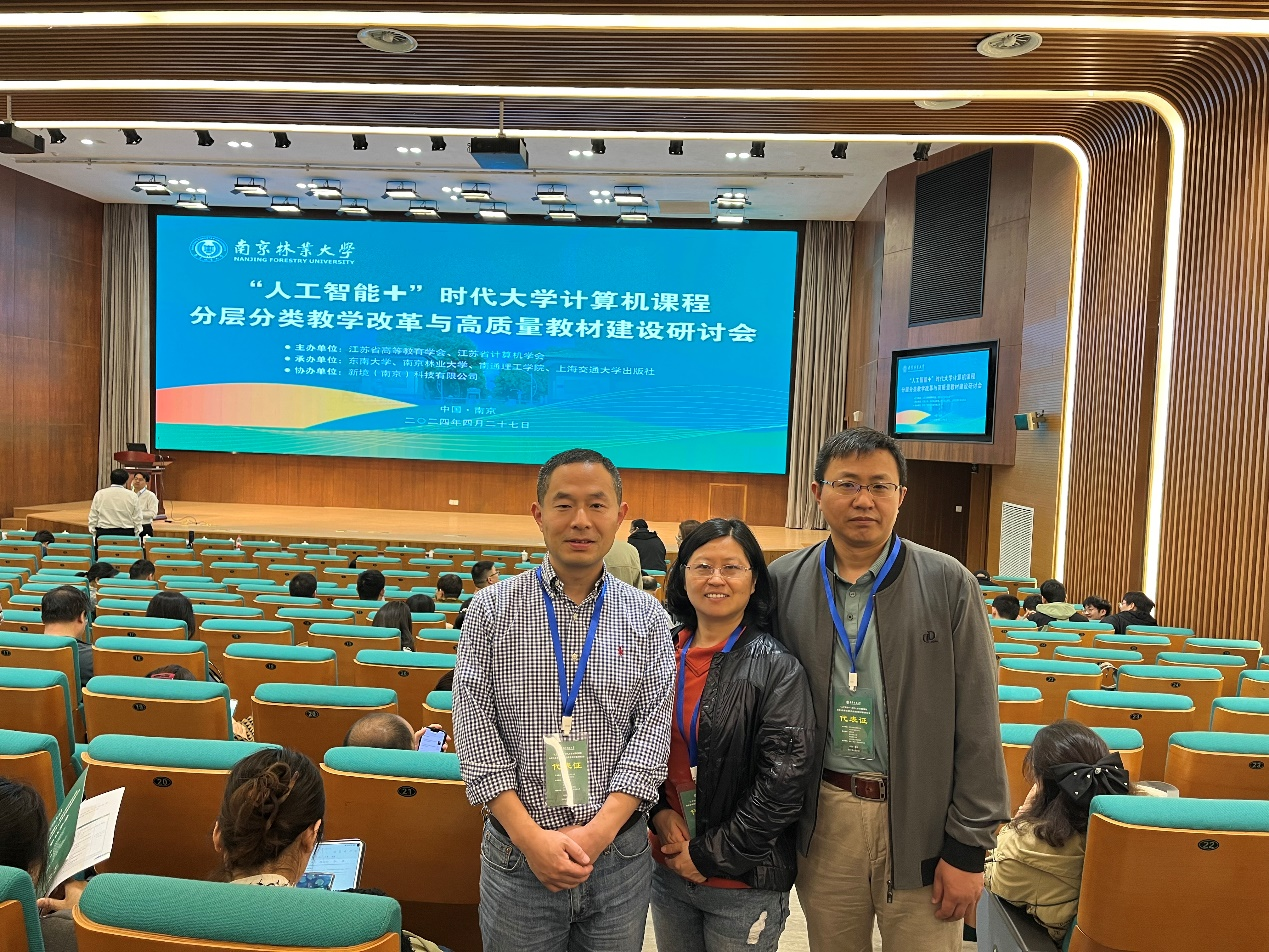 4月27日,“人工智能+”时代大学计算机课程分层分类教学改革与高质量教材建设研讨会在南京林业大学图书馆第一报告厅举行。本次会议由江苏省高等教育学会、江苏省计算机学会主办,东南大学、南京林业大学、南通理工学院、上海交通大学出版社承办。QY球友会经理方伟,计算机系陈璟,计算机系桑庆兵等三位老师出席了会议。