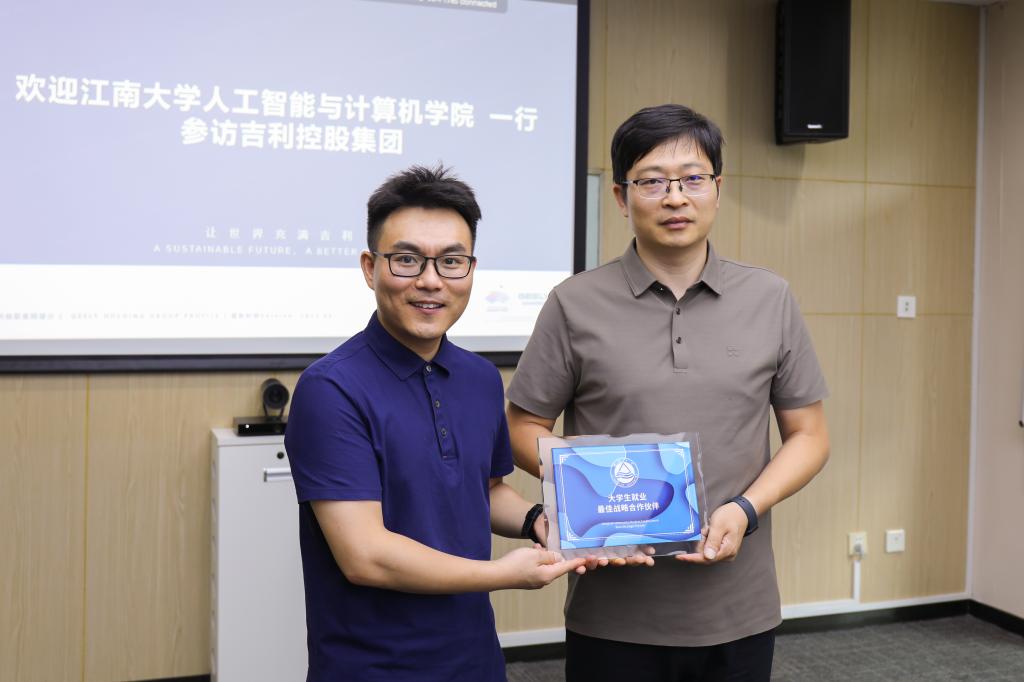在吉利控股集团,陈琳一行在校园与雇主品牌华东大区经理甘晓霞的陪同下参观了展厅。座谈会上,校园与雇主品牌总监童部林介绍了吉利控股的概况及近年来人才招聘的变化趋势。王莉莉介绍了学院人才培养和员工就业概况。陈琳感谢吉利汽车对员工就业工作的大力支持,重点围绕信息技术岗位需求、岗位要素、引才政策等进行调研,他指出在人工智能与实体经济融合发展的大趋势下,双方要发挥各自优势,深度融合吉利雄厚的产业资源和学院在人工智能领域研究的技术成果及培养的人才资源,不断实现双向赋能。